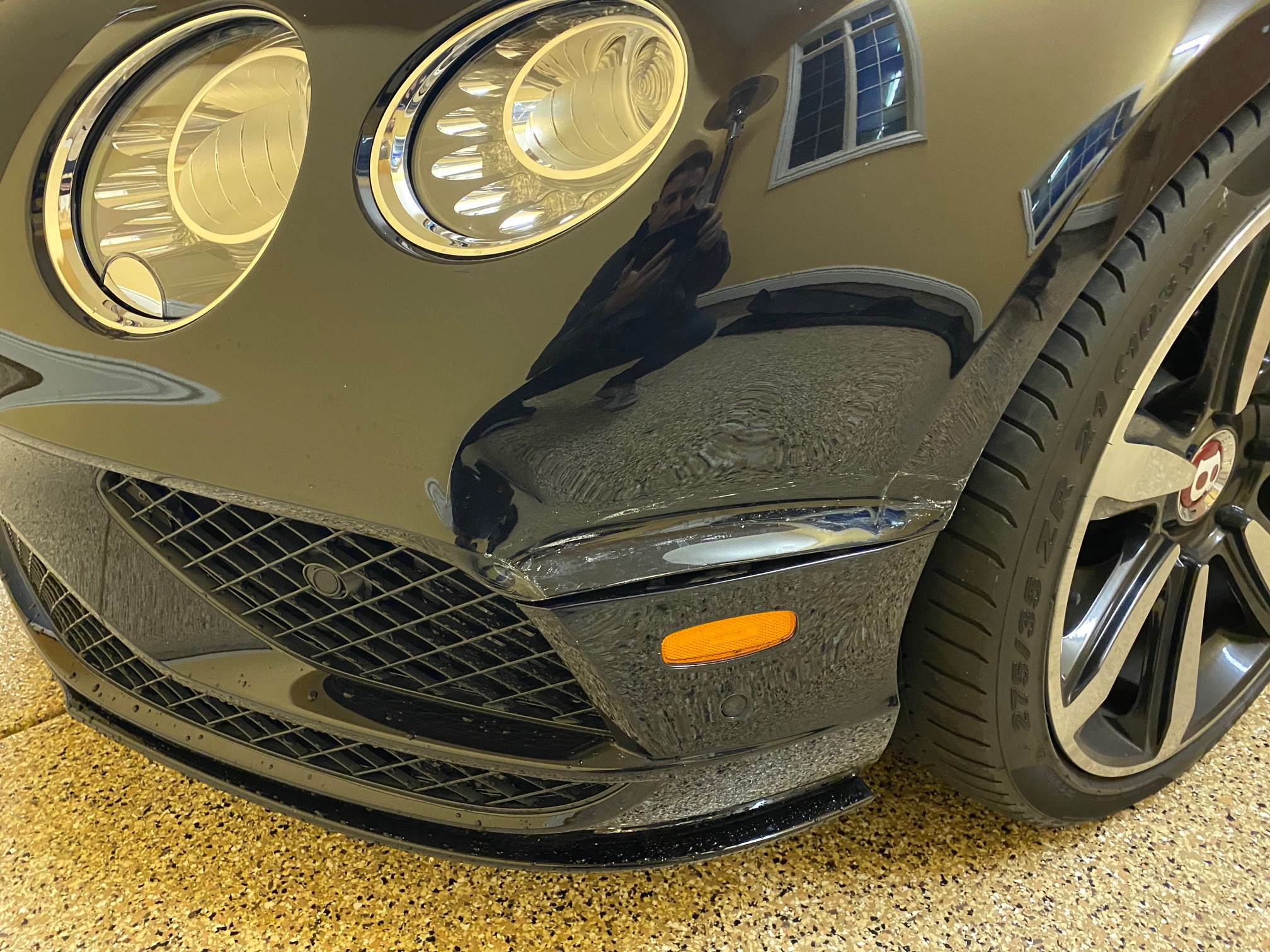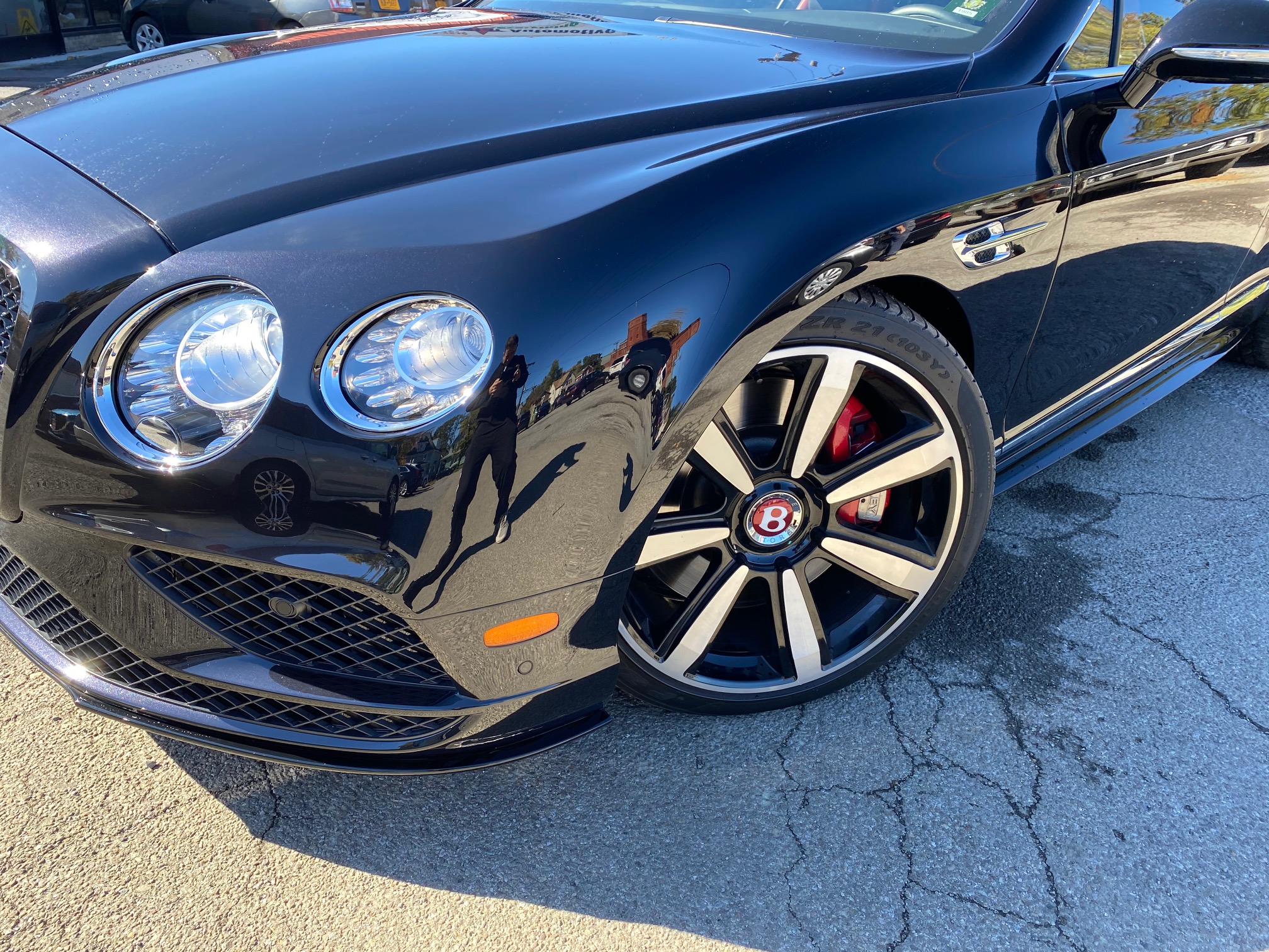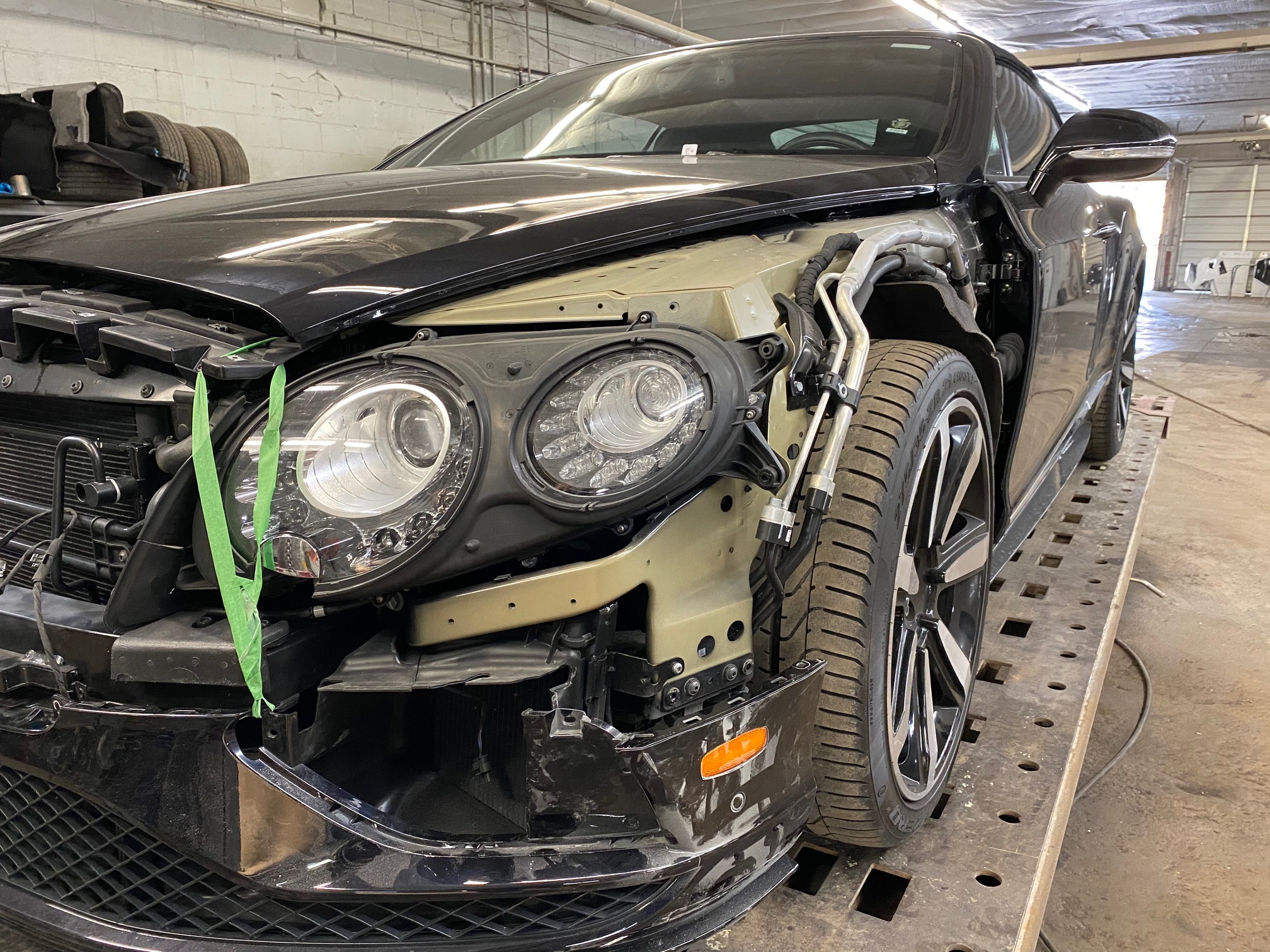 This Bentley underwent precision body repair and refinishing following front-end damage. The fender was carefully repaired, prepped, and refinished off the vehicle to ensure exact color match and flawless panel alignment. Finished in a deep gloss black, the repair blends seamlessly with surrounding panels, restoring the vehicle’s factory appearance and mirror-like finish.