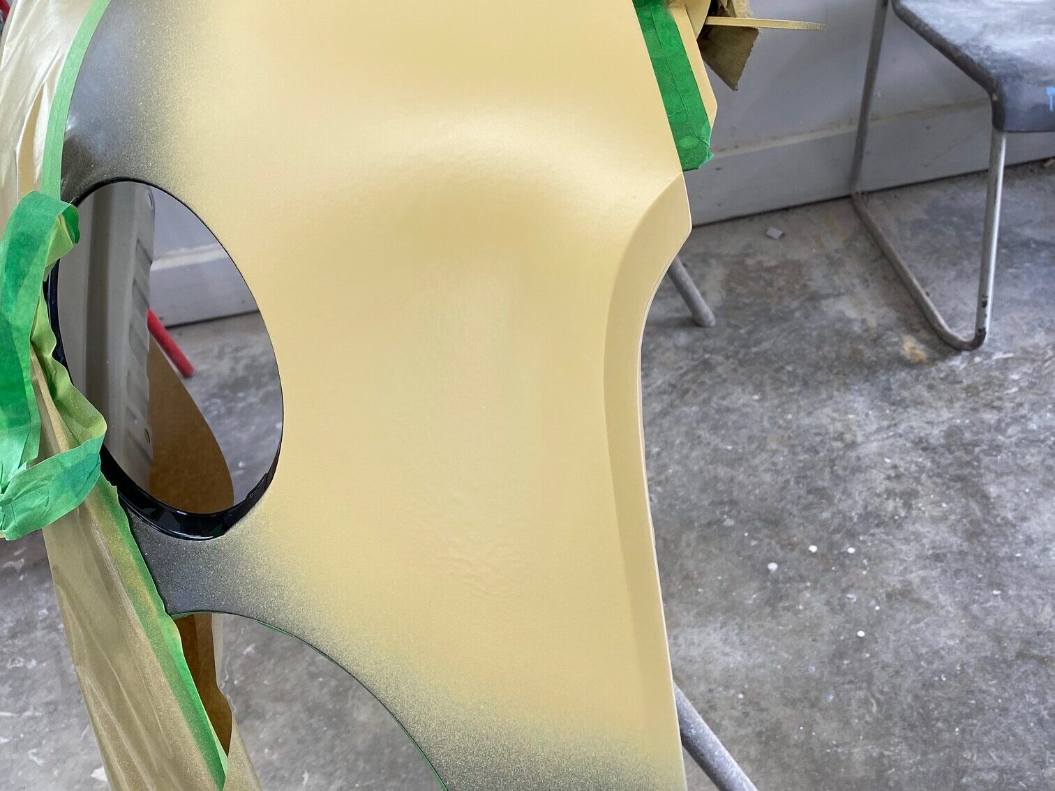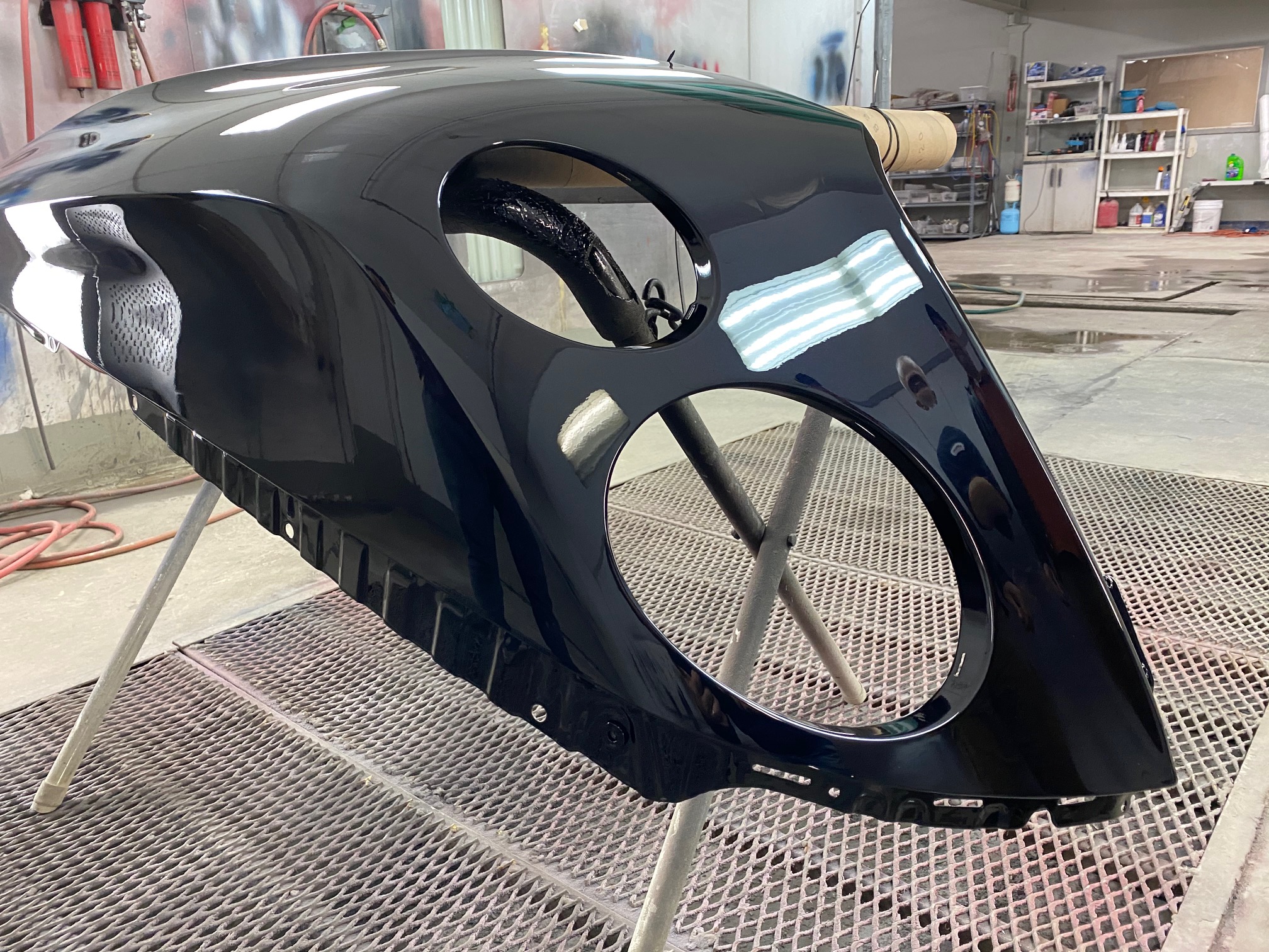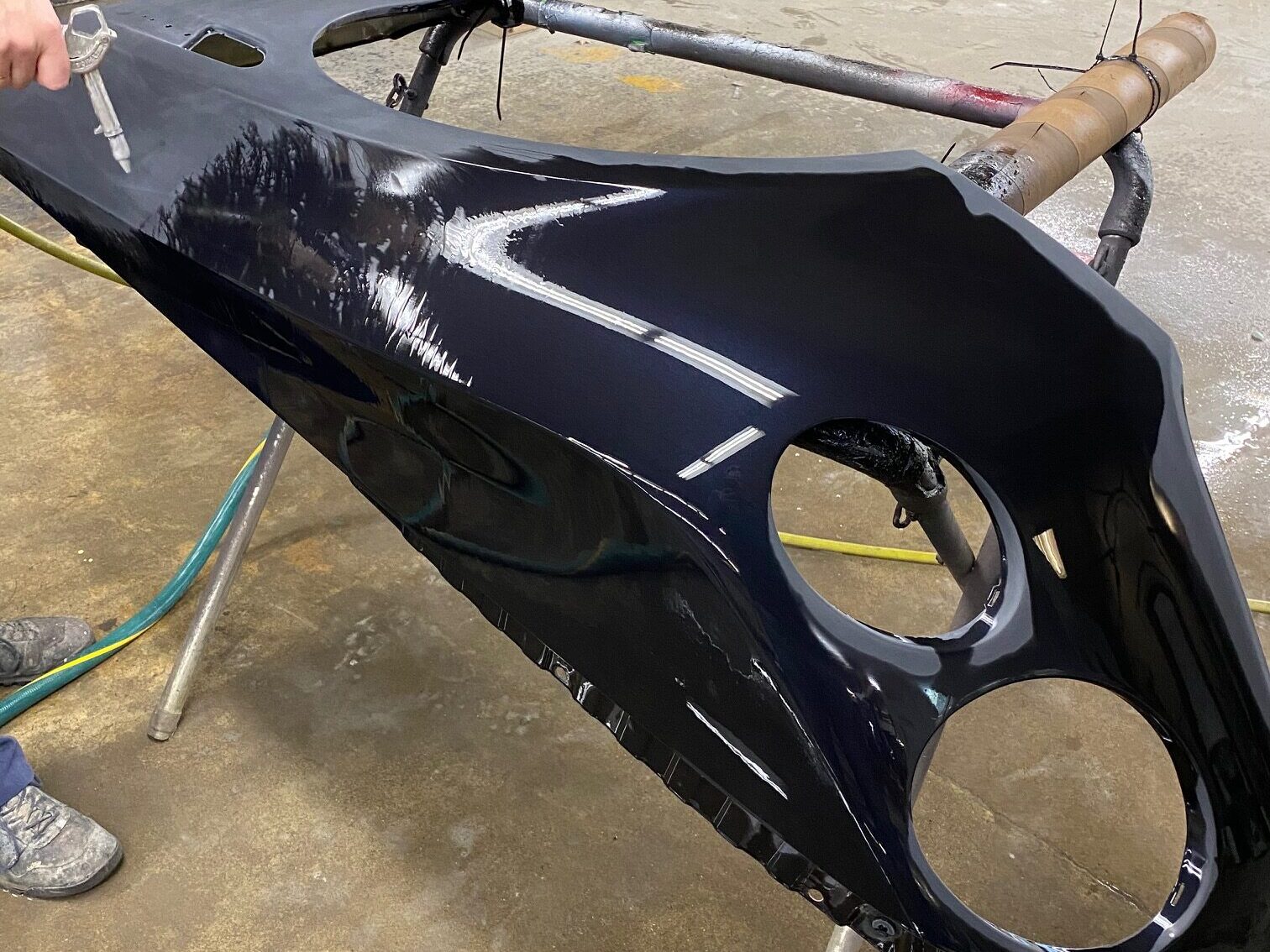 This Bentley underwent precision body repair and refinishing following front-end damage. The fender was carefully repaired, prepped, and refinished off the vehicle to ensure exact color match and flawless panel alignment. Finished in a deep gloss black, the repair blends seamlessly with surrounding panels, restoring the vehicle’s factory appearance and mirror-like finish.