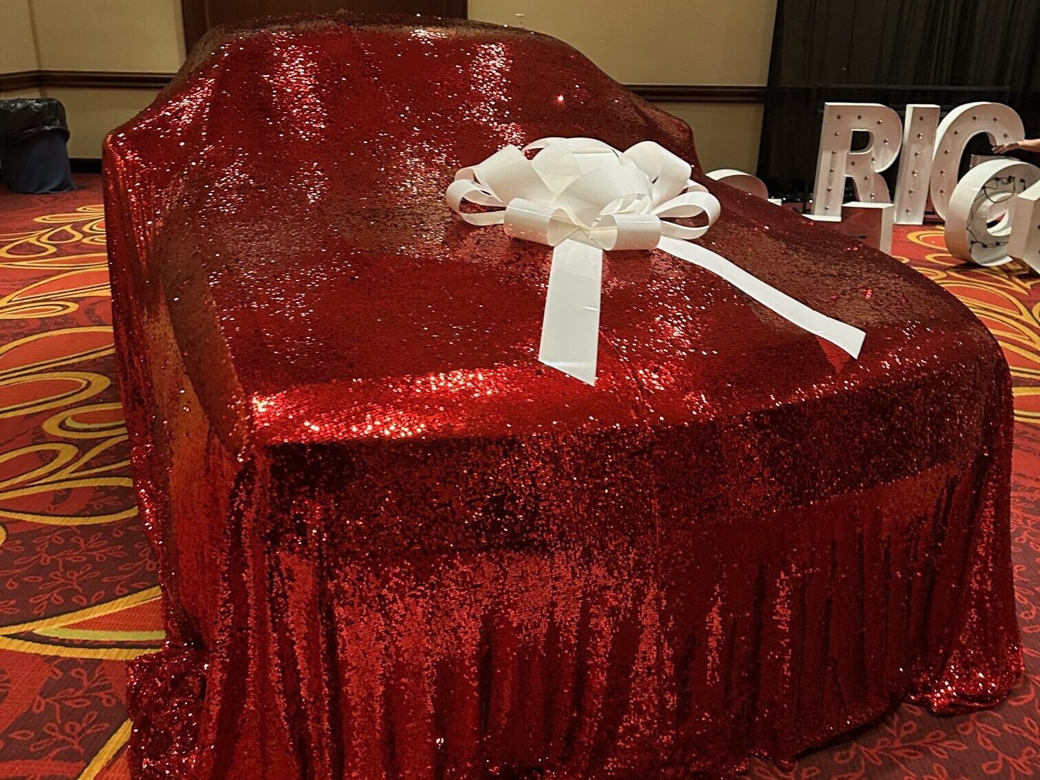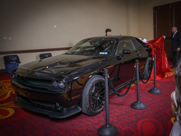 This Dodge Challenger birthday project was a custom reveal setup for a special event, featuring a dramatic covered presentation followed by an unveiling at the party to highlight the vehicle as the centerpiece surprise.