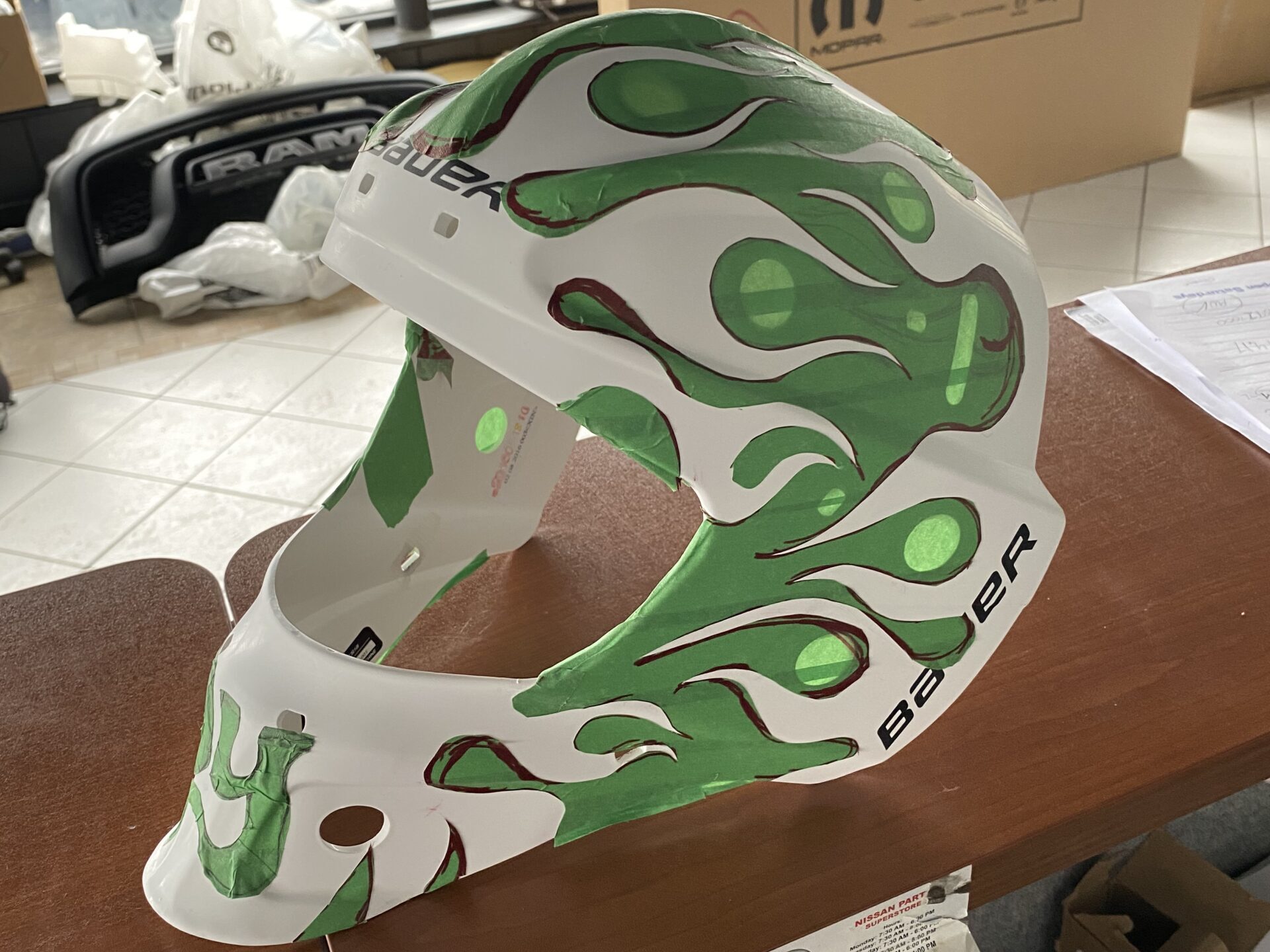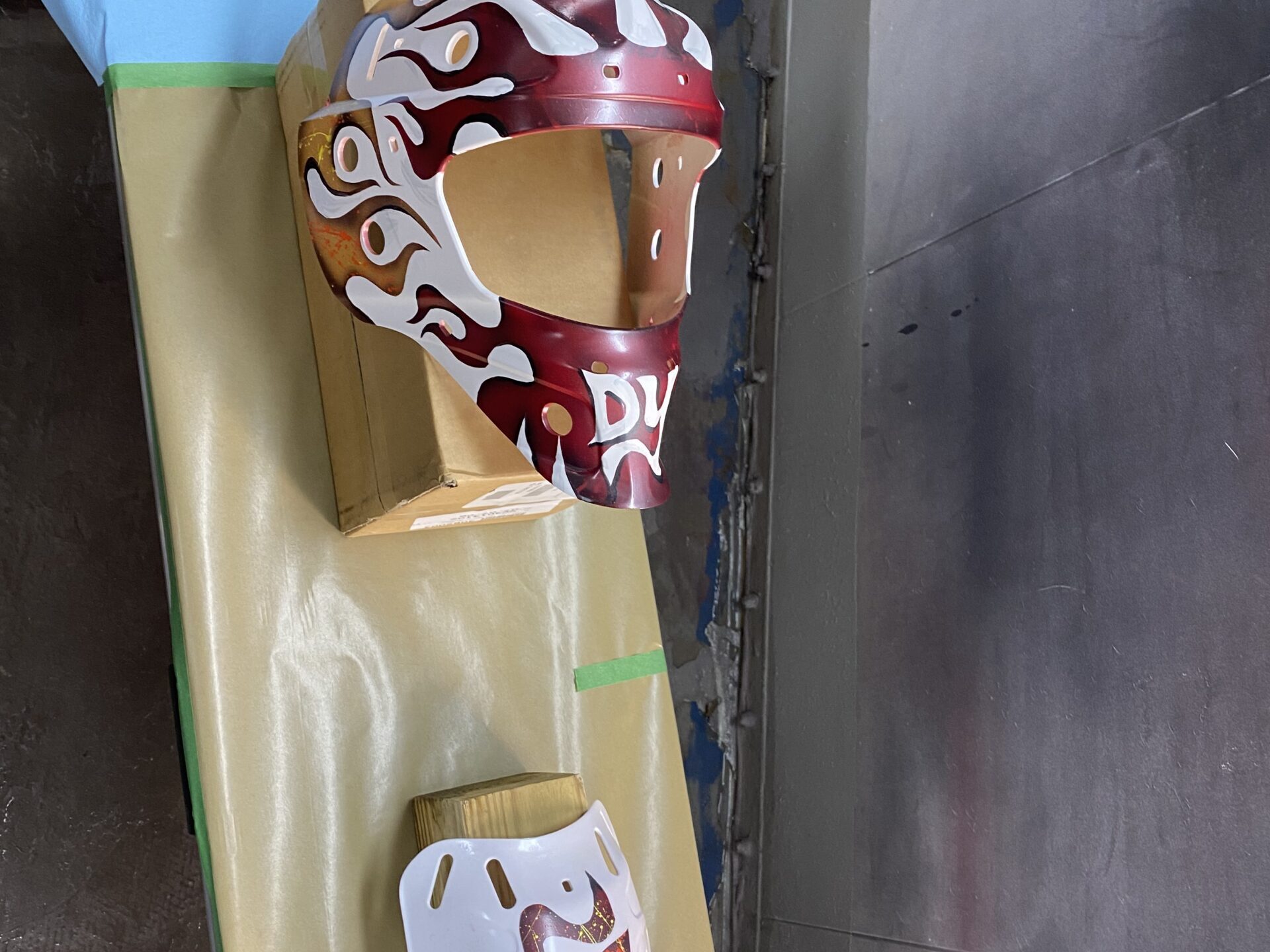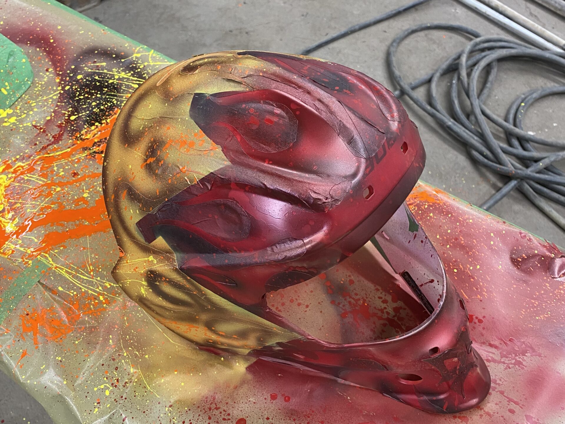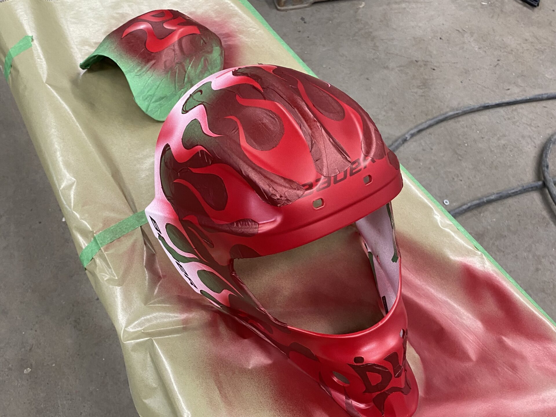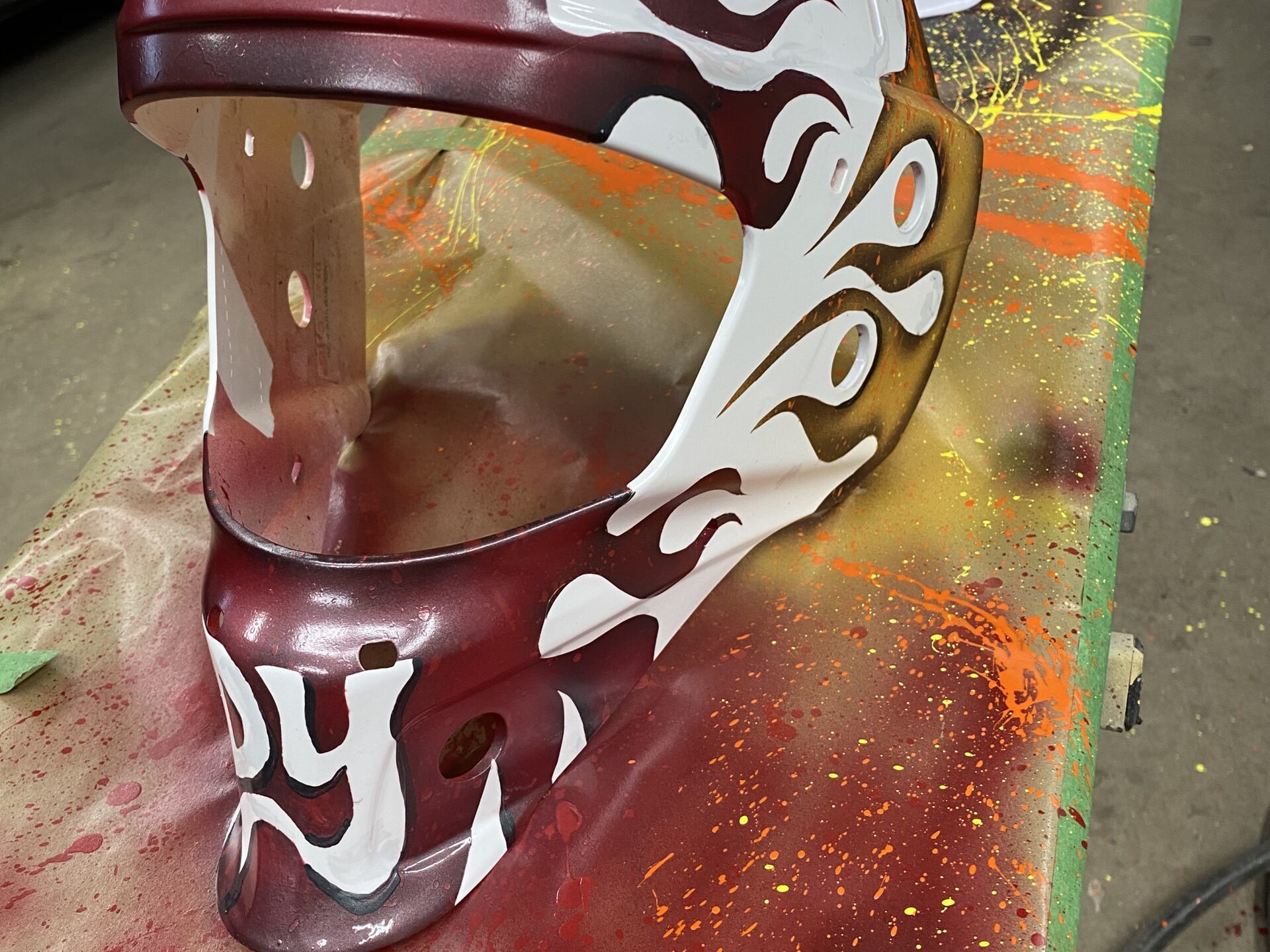 Custom fire-themed paint job on a lacrosse helmet, featuring hand-painted flame details and a high-gloss clear coat finish to create a bold, durable, and eye-catching design.