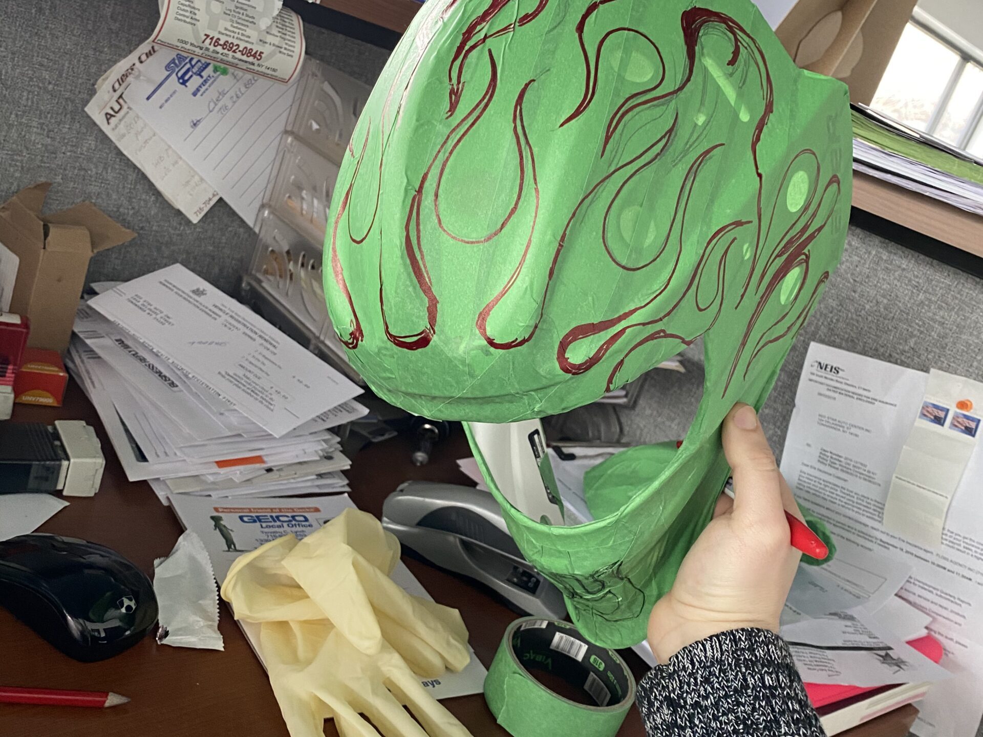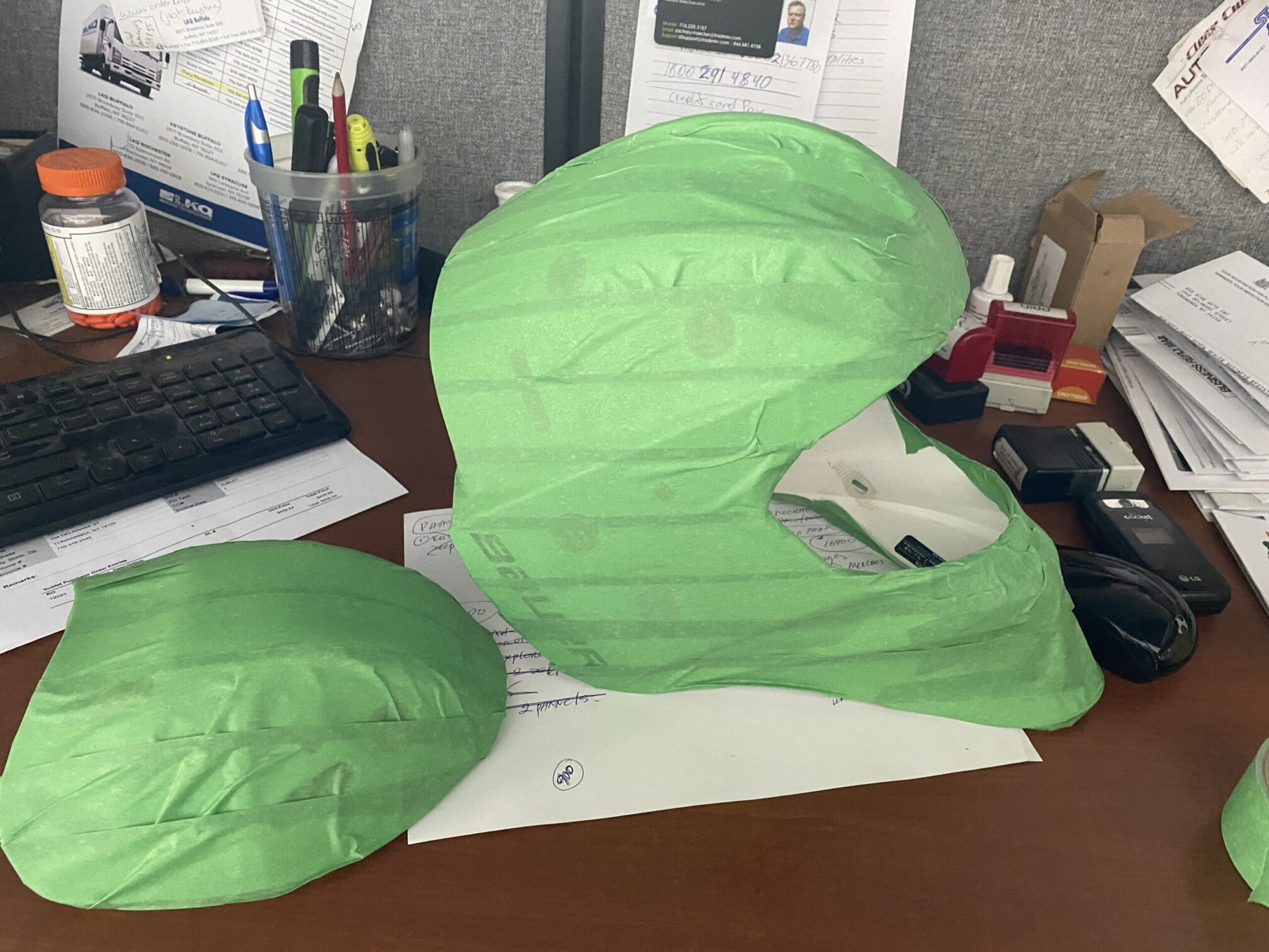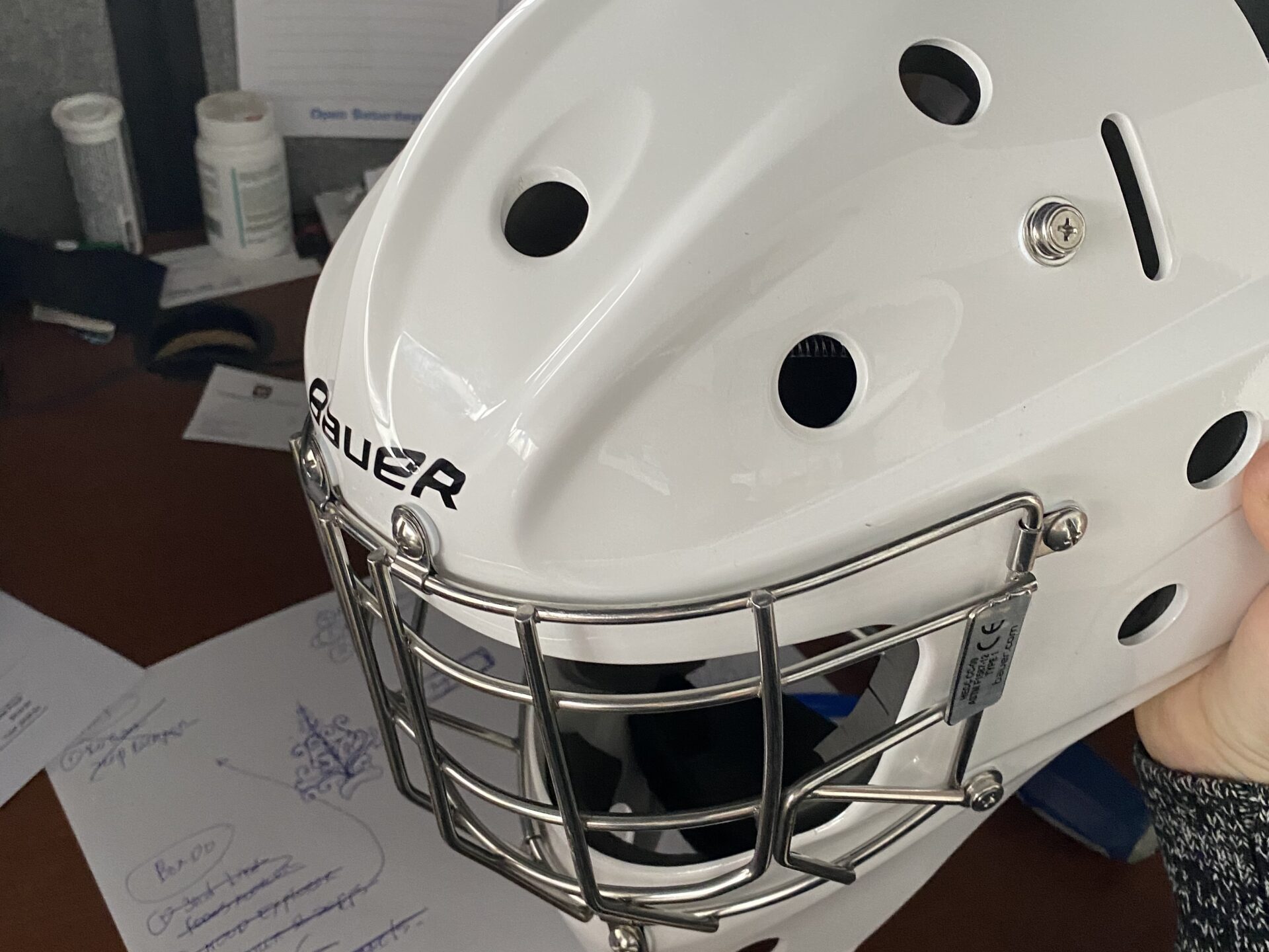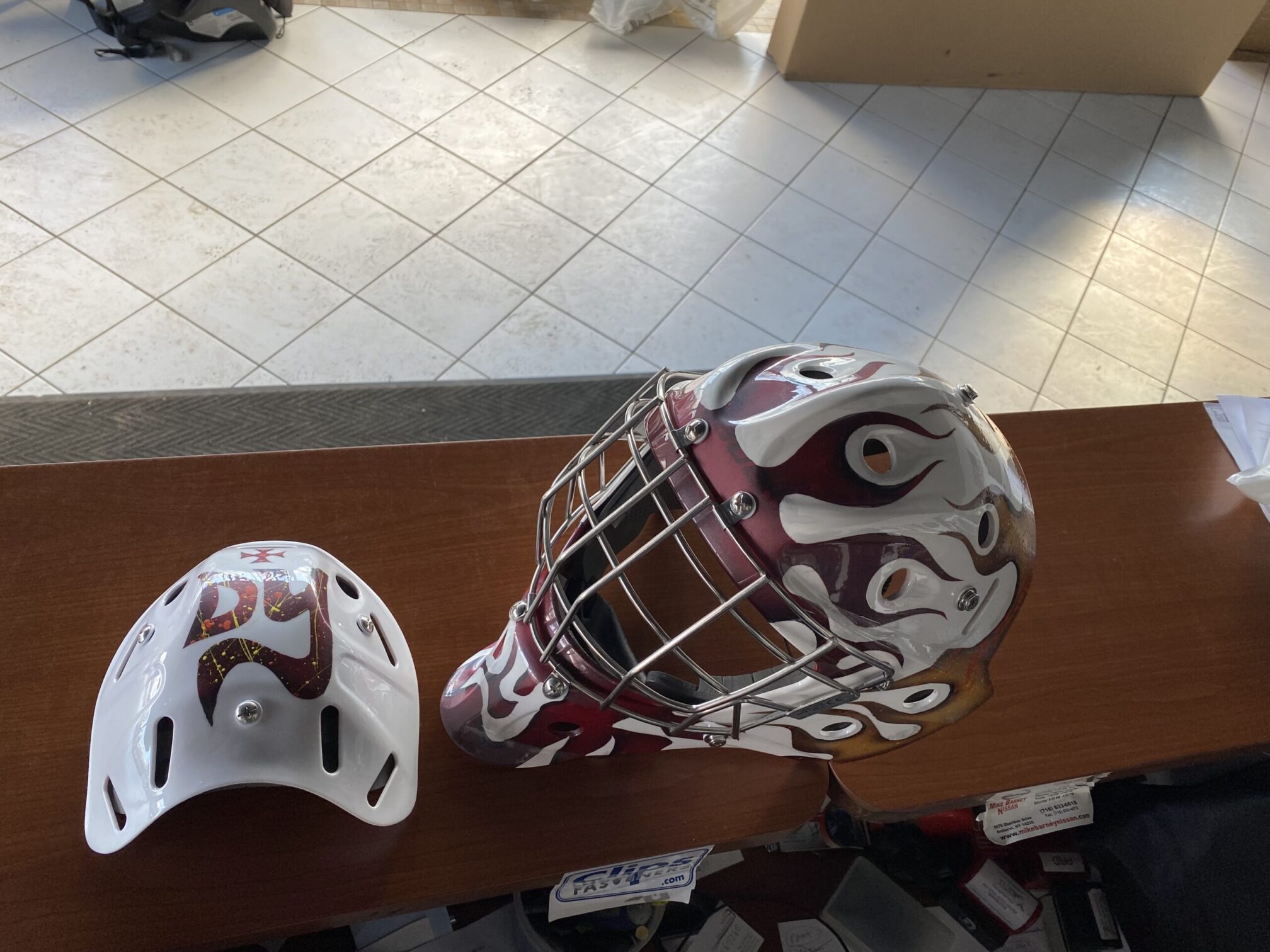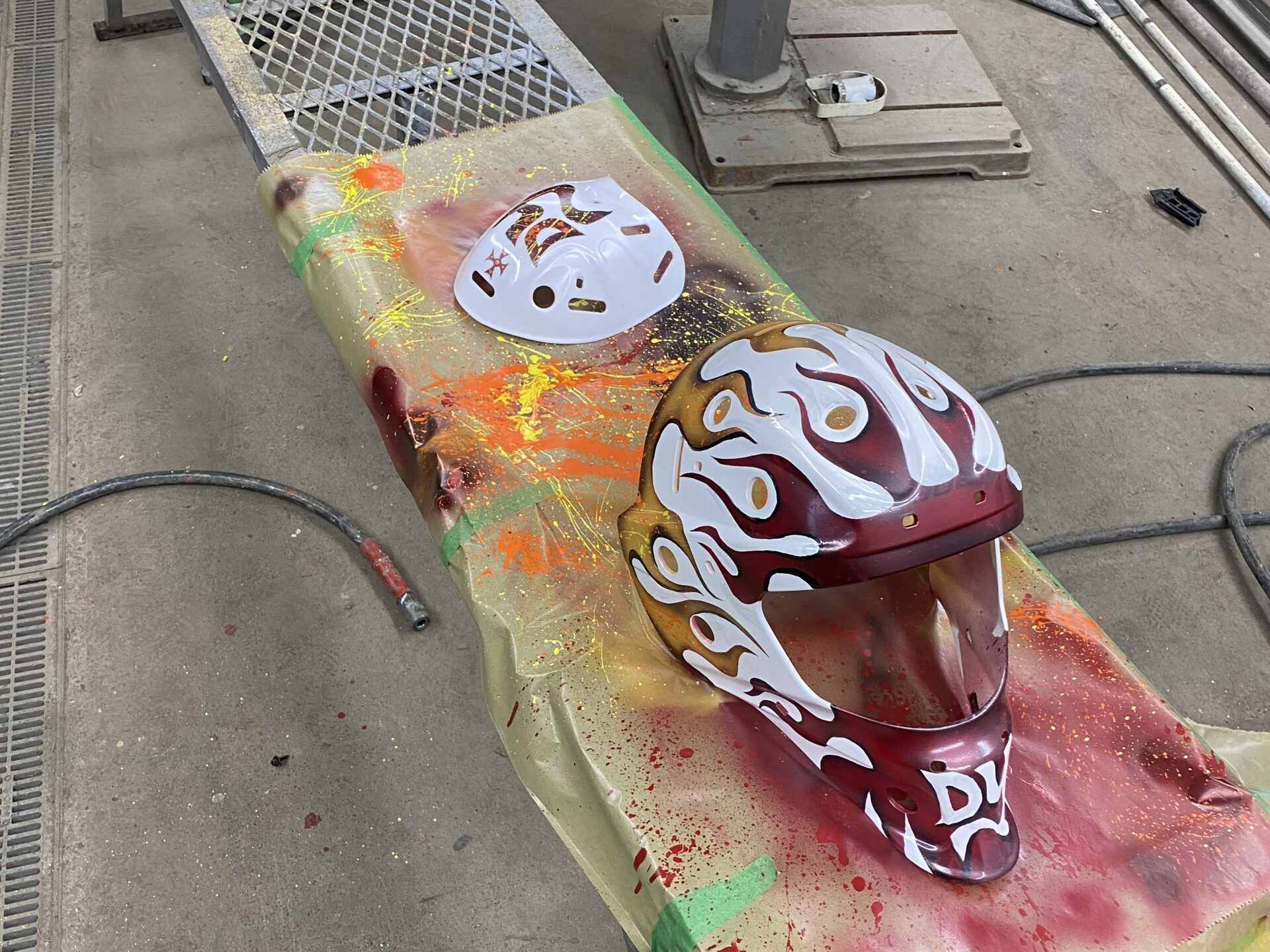 Custom fire-themed paint job on a lacrosse helmet, featuring hand-painted flame details and a high-gloss clear coat finish to create a bold, durable, and eye-catching design.