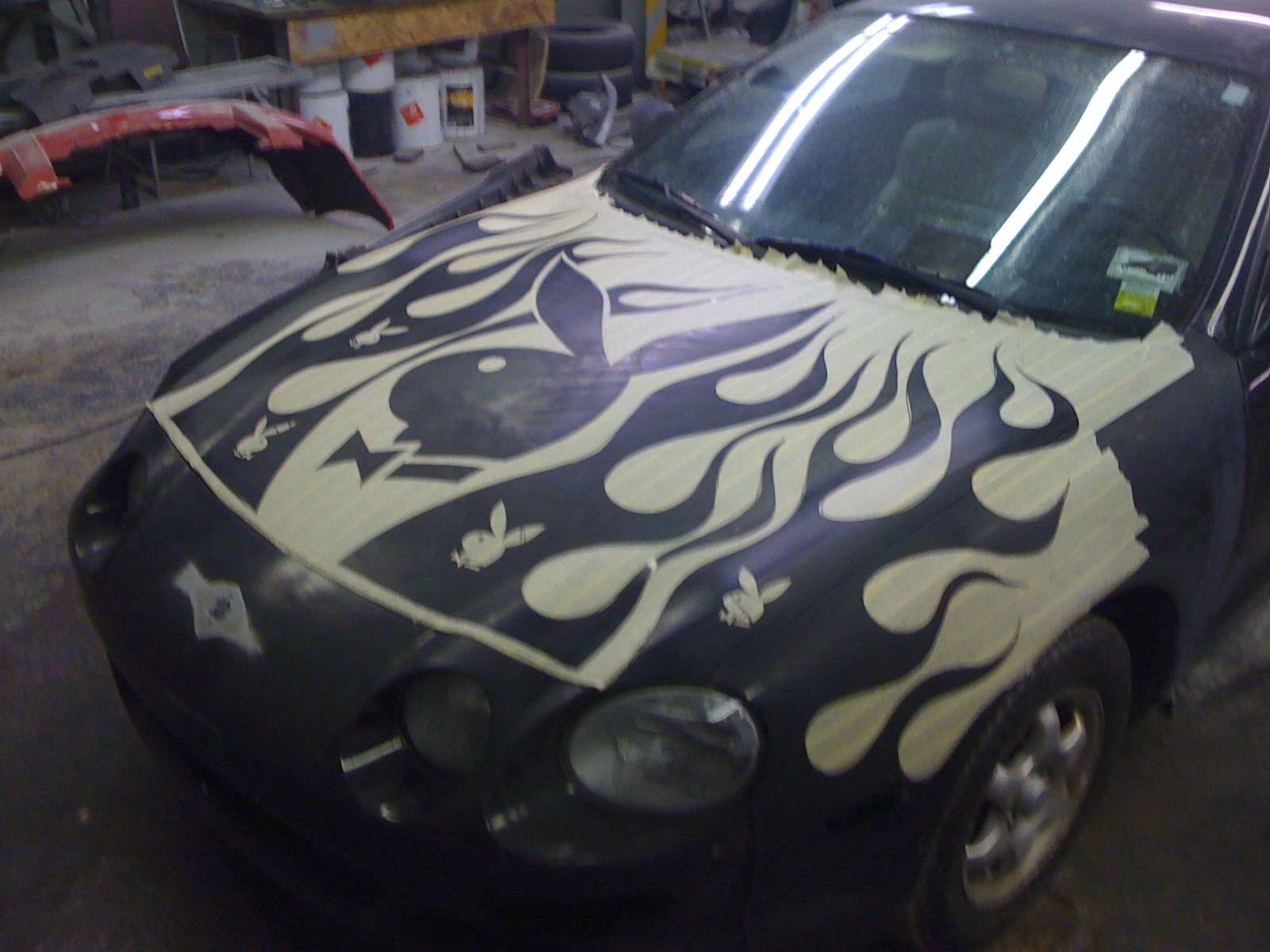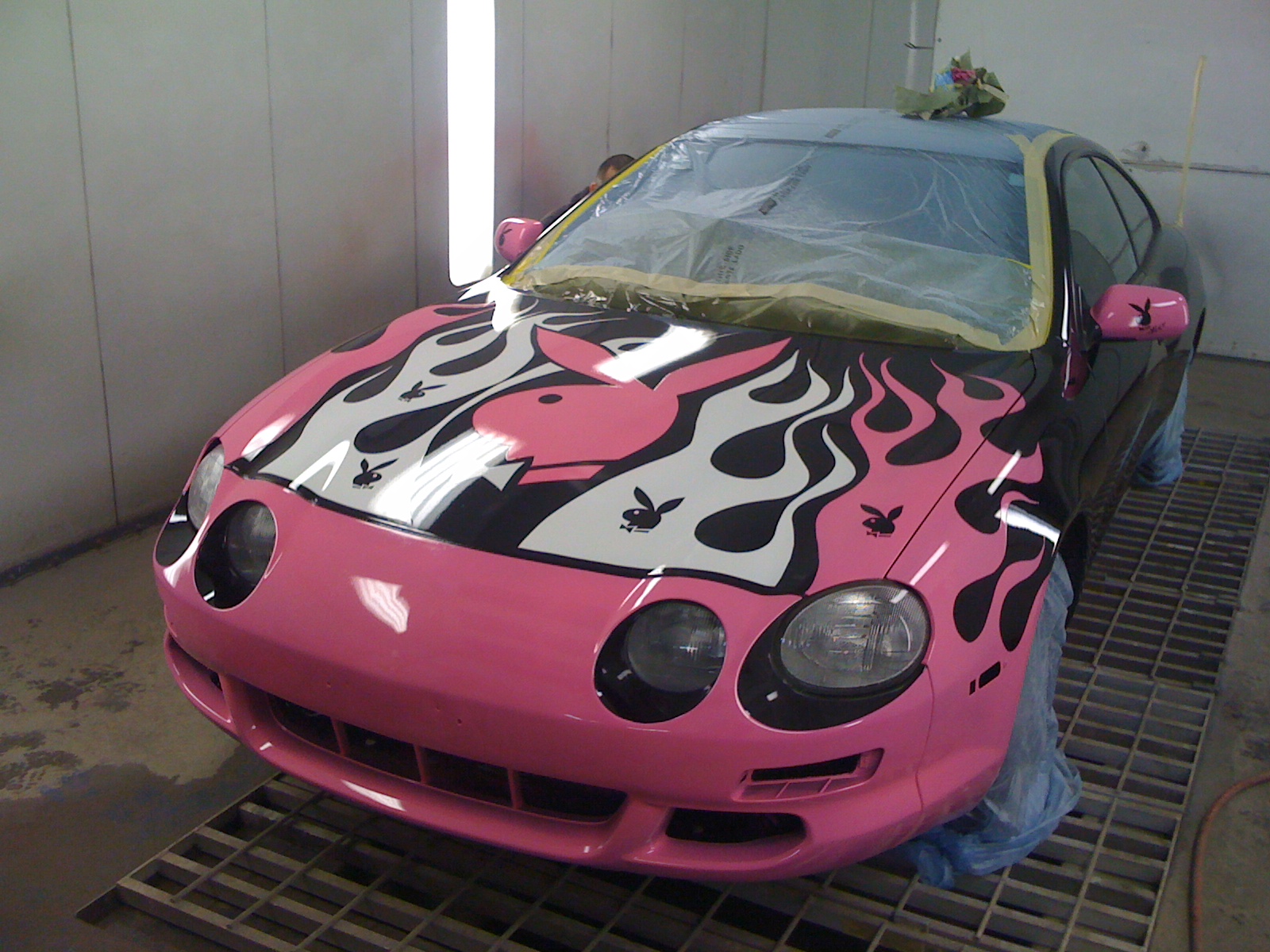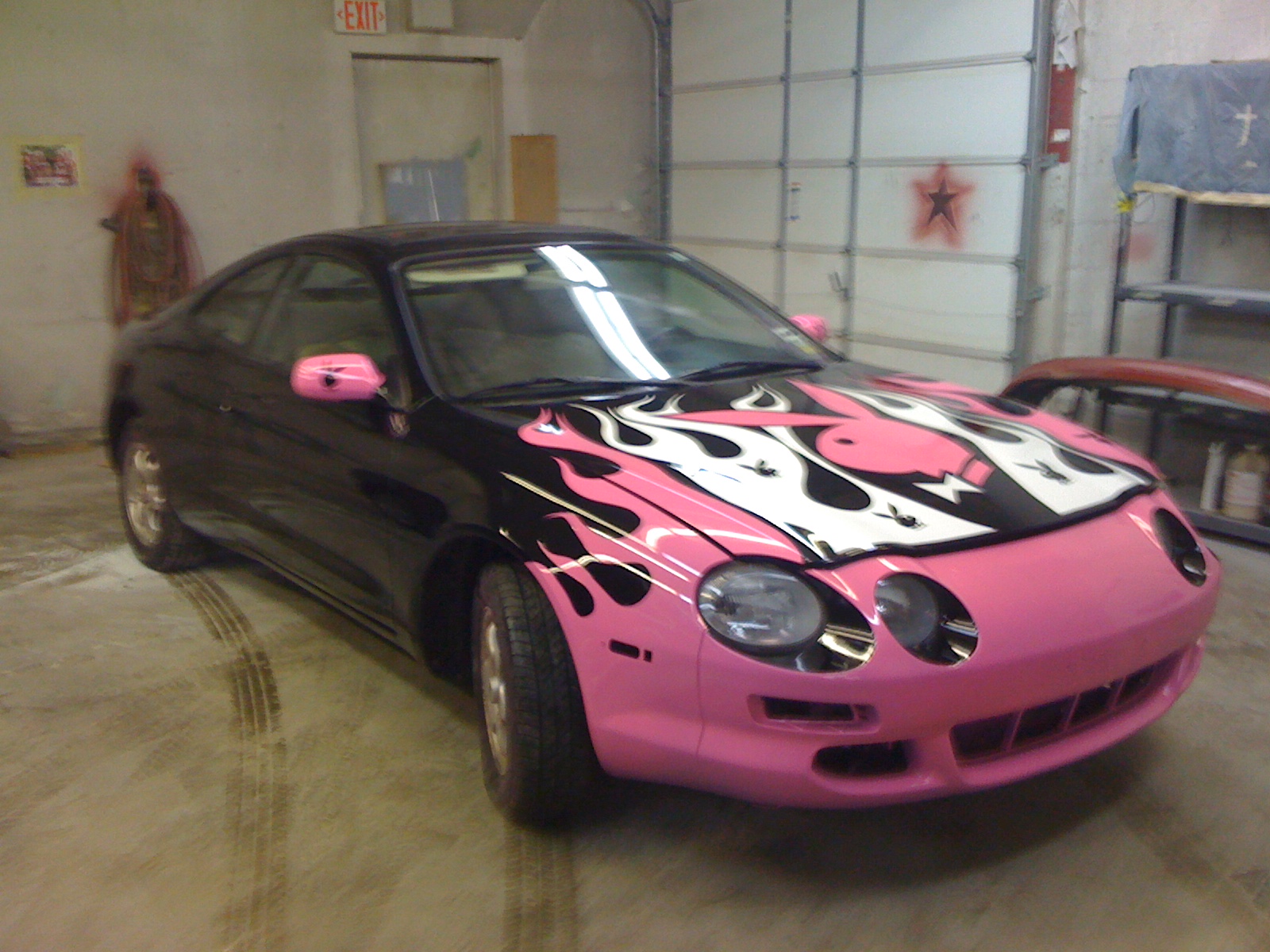 This Toyota received a full custom paint treatment featuring a bold Playboy Bunny and flame graphic design. The project involved surface preparation, masking, and precision layout of the artwork, followed by layered color application and a clear coat finish. The result is a high-contrast, eye-catching custom paint job that transforms the car’s appearance with a clean, polished final look.